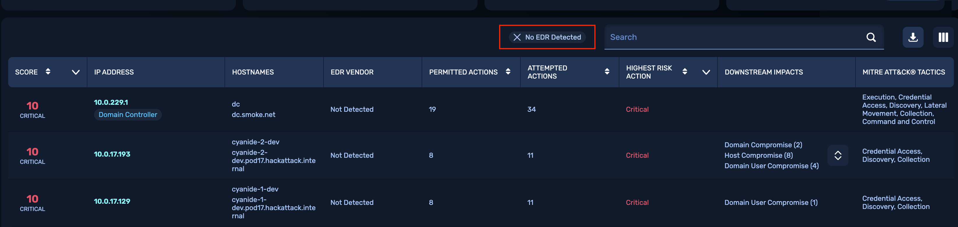 - EDR vendor breakdown: Which EDR vendors were discovered, with data on the percentage of actions blocked or permitted by one or more EDRs on each host.