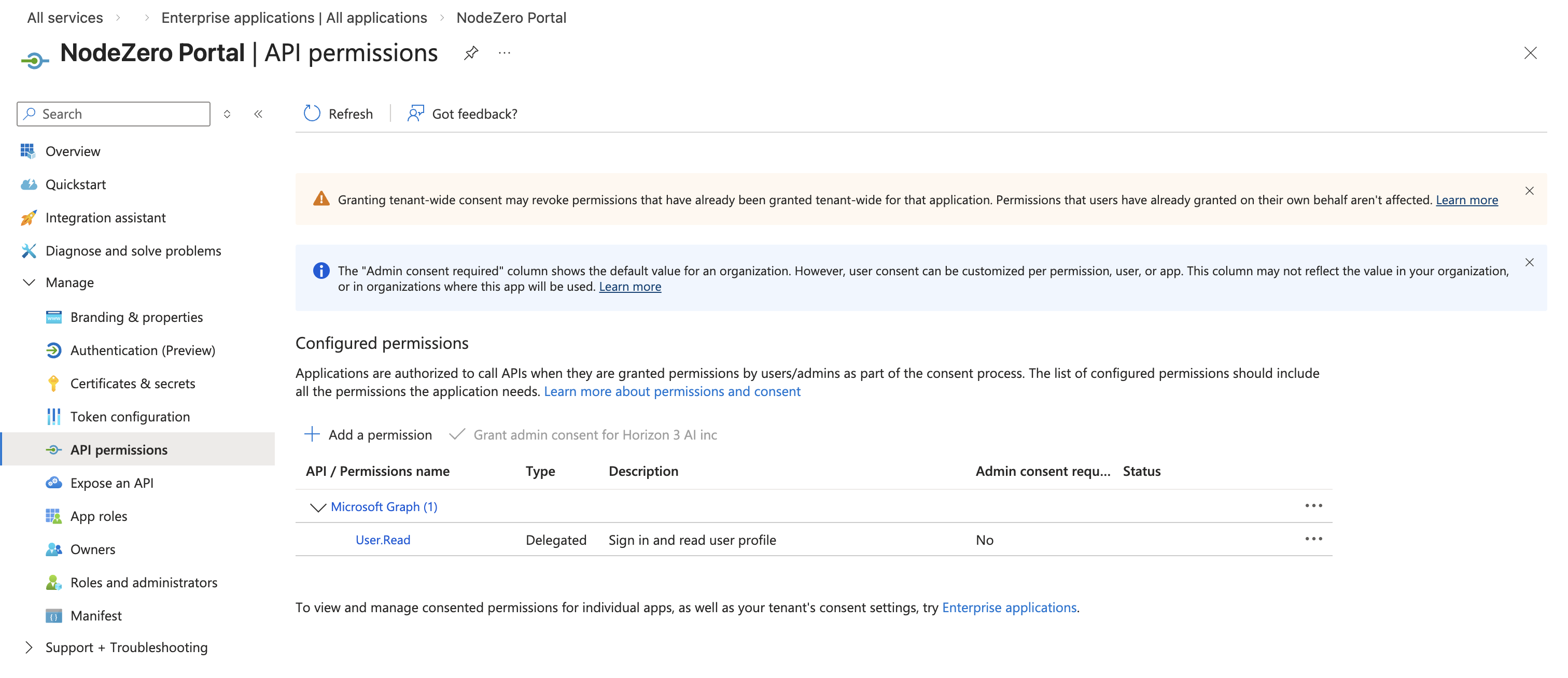 | Sign-in redirect URIs | https://portal.horizon3ai.com https://auth.horizon3ai.com/oauth2/idpresponse |